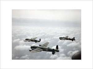 Three Avro Lancaster B Mark Is of No 44 Squadron, Royal Air Force based at Waddington, Lincolnshire, flying above the clouds. Left to right: W4125, `KM-W', being flown by Sergeant Colin Watt, Royal Australian Air Force; W4162,`KM-Y', flown by Pilot Offic