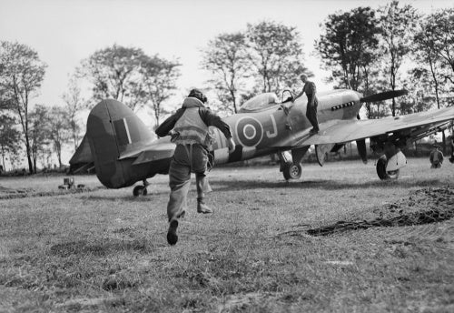 A pilot of No. 175 Squadron RAF scrambles to his waiting Hawker Typhoon Mk IB fighter-bomber at Le Fresne-Camilly in Normandy, 24 July 1944.