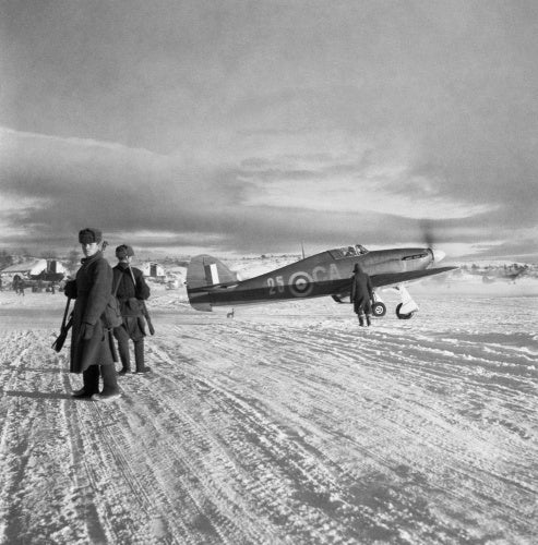 A Hawker Hurricane Mk IIB of No. 134 Squadron RAF taxies out past Russian sentries at Vaenga, near Murmansk, October 1941.
