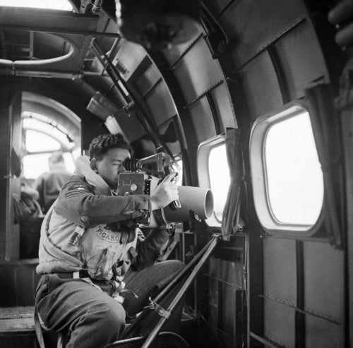 A crewman on board an RAF Coastal Command Lockheed Hudson of No. 269 Squadron, using an F.24 camera during an ice patrol from Kaldadarnes in Iceland, 5 May 1942.