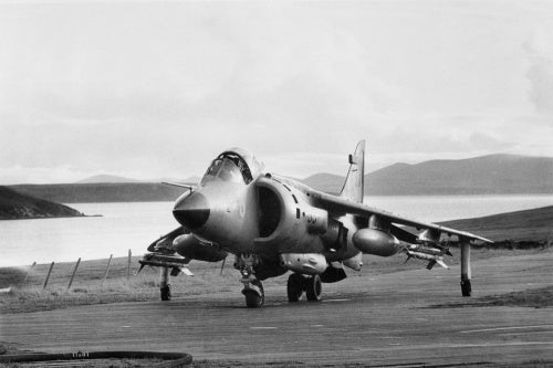 A Sea Harrier on the temporary airstrip constructed at San Carlos on the Falkland Islands, named HMS SHEATHBILL, June 1982.