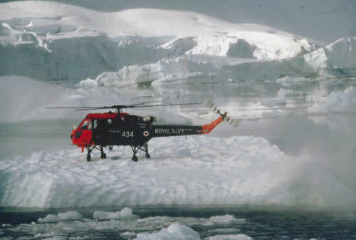 A Wasp helicopter from the Ice Patrol Ship HMS ENDURANCE touches down on pack ice during a survey operation in the Antarctic, 1980.