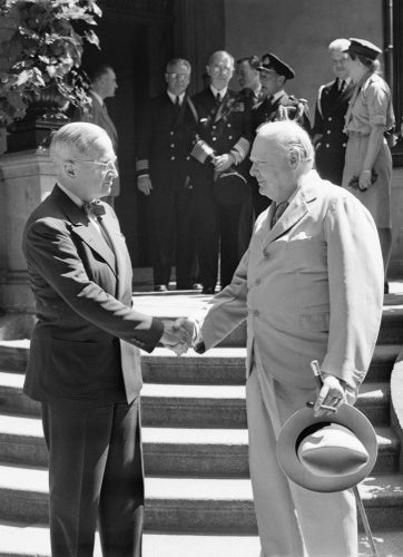 President Harry Truman and Winston Churchill shake hands on the steps of Truman's residence during the Potsdam conference, 16 July 1945.