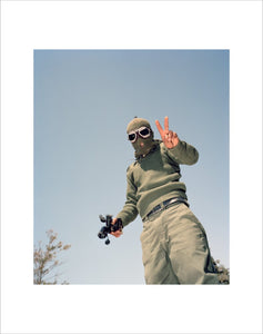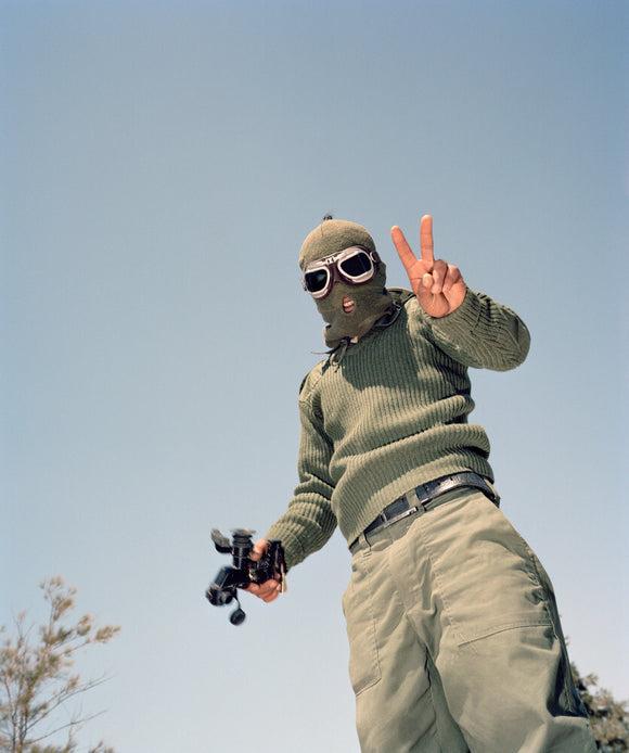 On the highway between Ajdabiya and Brega, an anti-Gaddafi fighter wearing an olive green military uniform, balaclava and dark-tinted goggles makes a victory sign with one hand in the air. Photographed by Tim Hetherington.