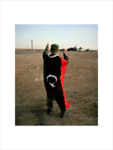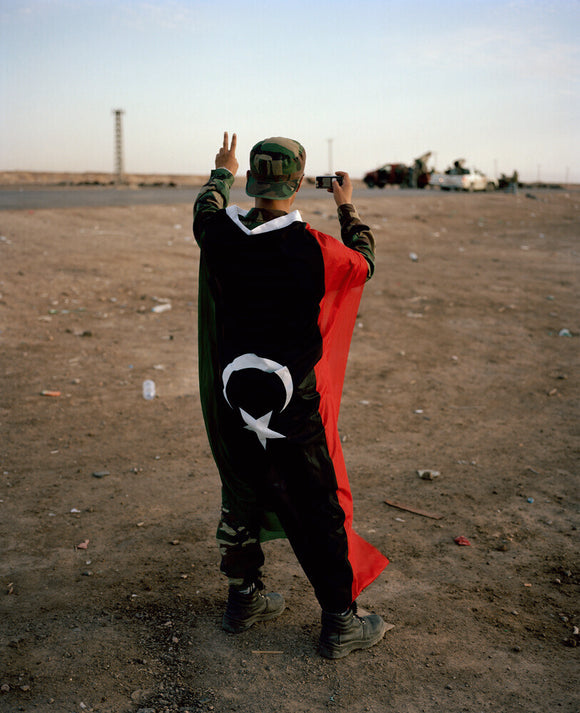 On a road side near Ajdabiya in Eastern Libya, a man takes a photograph of anti-Gaddafi fighters on his mobile phone whilst making a V for victory hand signal. The men is draped in a pre-Gaddafi era Libyan flag, April 2011.