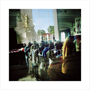 The reflection in a glass window of a queue of people during the first round of the Liberian presidential election. Their votes are being cast at the Centennial Pavilion polling station in Monrovia, Liberia. October 2005.