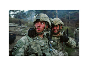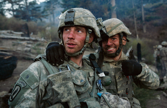 Two soldiers (Specialist Sylvester Dunn, left) from 2nd Platoon Battle Company, 2nd Battalion, 503rd Airborne Infantry Regiment, 173rd Airborne Brigade in the Korengal Valley. The platoon had been partaking in Operation Rock Avalanche: an operation which aimed to draw out insurgents, disrupt weapons supplies, and capture or kill key Taliban/insurgent leaders. October 2007.