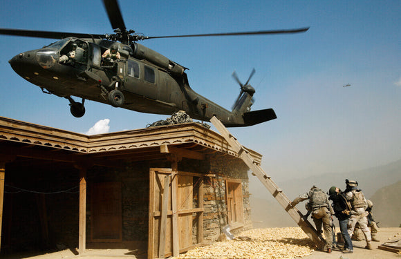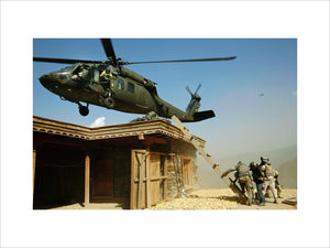 A US Army U-60 Blackhawk helicopter coming into land on a rooftop in the village of Yaka Chinaa, as US military personnel and conflict journalists wait at the bottom of a ladder to climb aboard. Afghan National Army and 2nd Platoon, Battle Company, 2nd Battalion, 503rd Infantry Regiment, 173rd Airborne Brigade personnel have been conducting searches following an incident where a US Army AH-64 Apache helicopter fired on an Afghan civilian house killing five people, including a woman and two children. 2nd Platoon are taking part in Operation Rock Avalanche: an operation which aimed to draw out insurgents, disrupt weapons supplies, and capture or kill key Taliban/insurgent leaders. October 2007.