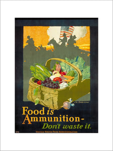 whole: The image fills the upper three-quarters of the design with text in orange and green underneath it. All is setagainst a black backgroundimage: A wickerwork garden basket filled with vegetables and fruit. In the background, depicted in silhouette against an orange sky, is ahorse-drawn US Army field gun team.text: Food is Ammunition -Don't waste it.UNITED STATES FOOD ADMINISTRATION