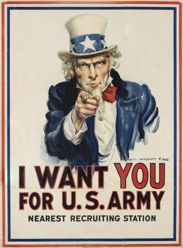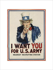 whole: The image is positioned in the upper half of the design with text in red and black placed underneath. All is setagainst a white background with a blue and red striped border.image: A portrayal of Uncle Sam in traditional top hat, jacket and bow tie pointing directly at the viewer, in the style of Alfred Leete'sfamous depiction of Kitchener