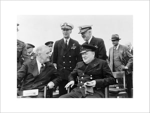 President Franklin D Roosevelt and Prime Minister Winston Churchill after Divine Service on board HMS PRINCE OF WALES. Immediately behind them are Admiral E J King, USN and Admiral Stark, USN. This photograph was taken during a series of meetings between