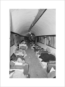 Shelterers sleep along the walls of the passageway leading from the lifts to the platform at a London Underground station, probably Aldwych, in November 1940. The shelterers lie on thin mattresses and suitcases have been used to partition off areas alon