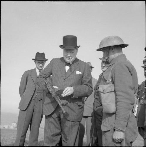 Winston Churchill, cigar in mouth, gives his famous 'V' for victory sign during a visit to Bradford, 4 December 1942.