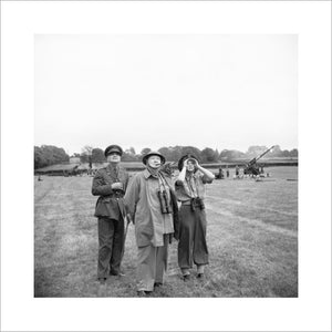 Winston Churchill, his daughter, Mary, and General Sir Frederick Pile (GOC Anti-Aircraft Command) watch a demonstration of measures used to combat flying bombs in the south of England on 30 June 1944.