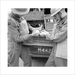 A message written on rice paper is put into a container and attached to a carrier pigeon by members of 61st Division Signals at Ballymena, Northern Ireland, 3 July 1941.