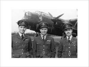 Wing Commander G P Gibson (centre), Officer Commanding No. 106 Squadron RAF, standing with his two Flight Commanders, Squadron Leader J H Searby (left) and Squadron Leader P Ward-Hunt, at Syerston, Nottinghamshire, on the completion of Gibson's tour of op