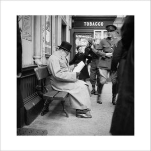 Winston Churchill reads a newspaper on the platform at St Andrews railway station, during a tour of defences and naval forces in Scotland, 23 October 1940.