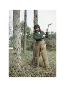 Jean Sheehan, a Land Army girl, chopping a tree.