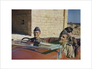 A red MG sports car with Air Vice Marshal Keith Park,  at the wheel and Air Vice Marshal Arthur Coningham